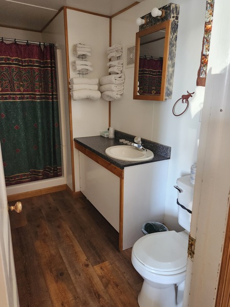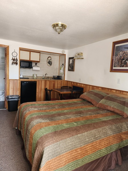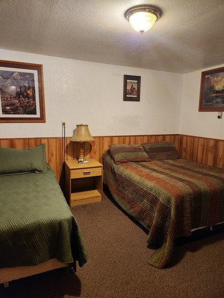 1 Queen bed, 1 Full bed, 1 Twin bed, Refrigerator, Microwave, Coffee, A/C, Flat Screen Cable TV. and Kitchen area appoint this room. These are 2 room suites set up for larger group comforts.